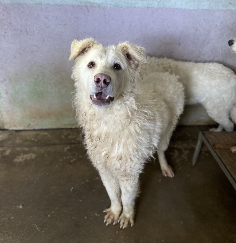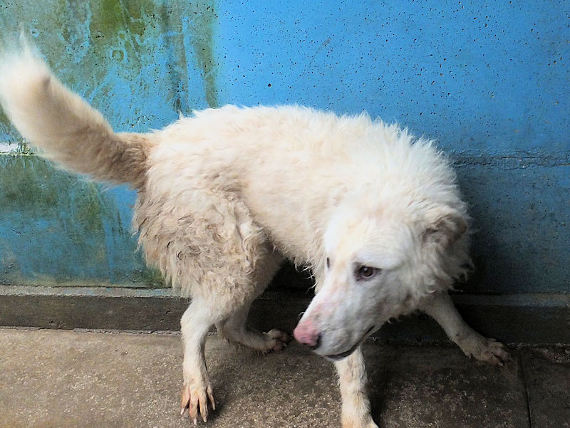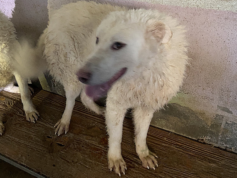 Brenno maremmano con zampette a papera è una taglia grande sui 40 kg. Nato a marzo 2024 e finito in canile a due mesi a maggio 2024  ZAMPETTE POSTERIORI A PAPERA