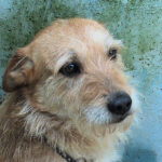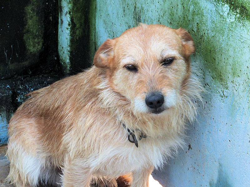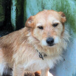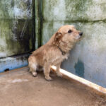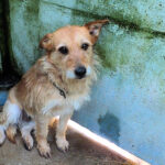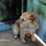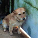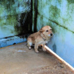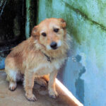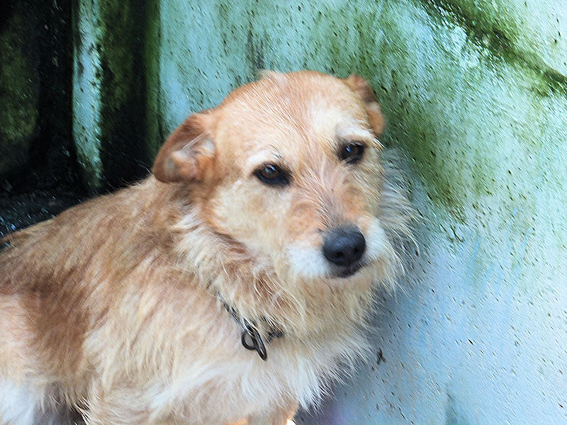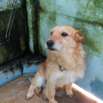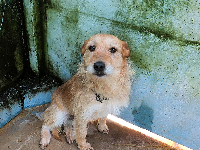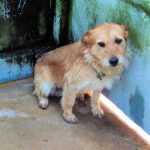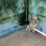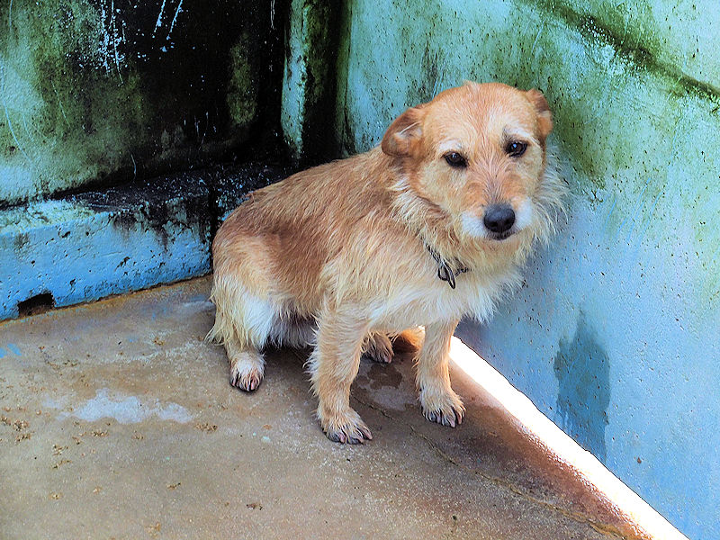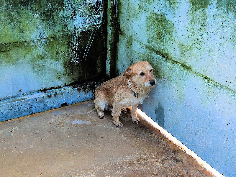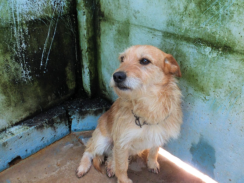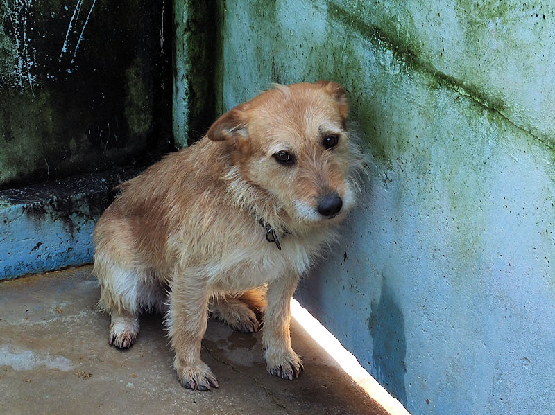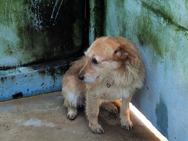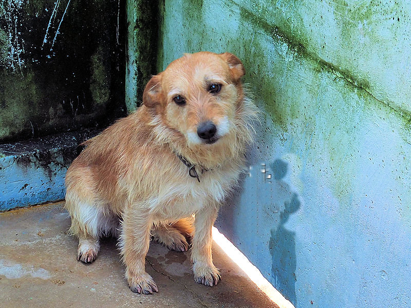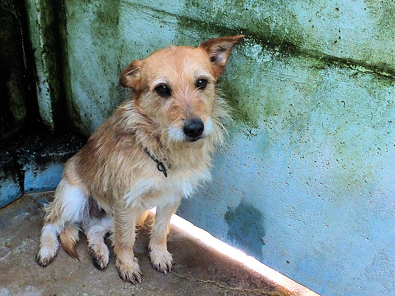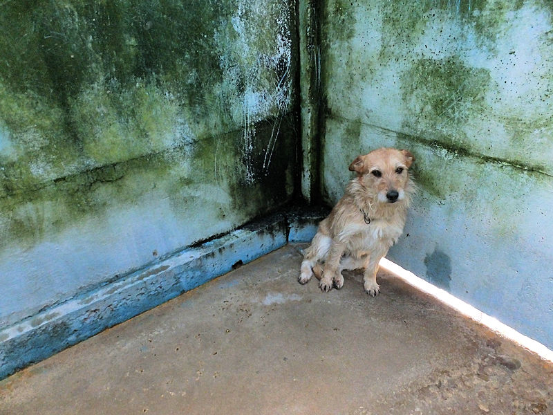 Entriamo in uno di questi box dove incontriamo  due cani gia’ conosciuti, Pisolo e Florio, che ci riempiono di coccole ed allegria. Ma vediamo spuntare da sotto una panca una codina tremante…riusciamo a  stanare dal suo nascondiglio   un cagnolino  piccoletto, carinissimo, e con due occhi pieni di terrore.