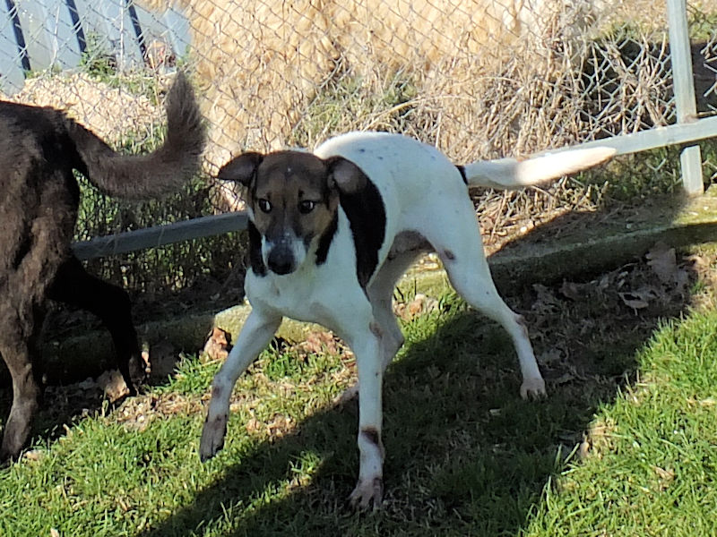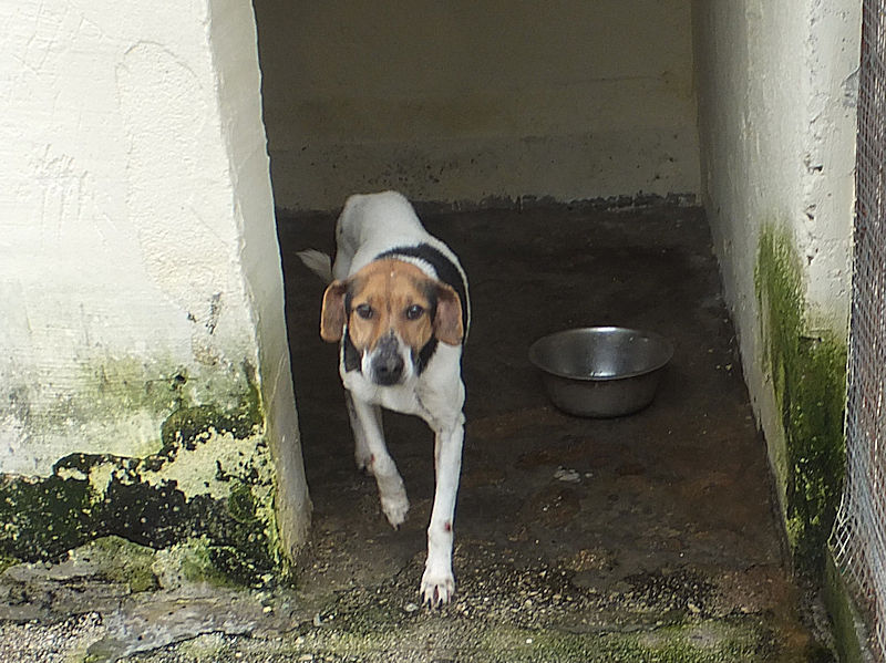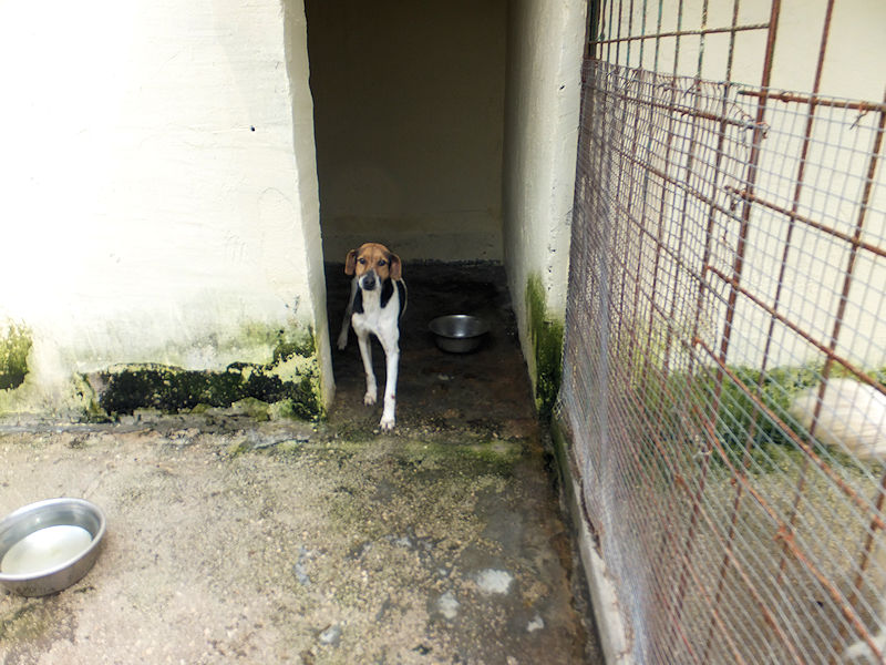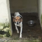 Dino bel cagnolino tipo segugio tricolore di taglia mediopiccola sui 13 kg è nato a marzo 2020 ed veva soltanto un anno e mezzo quando è finito in un box di canile a settembre 2021