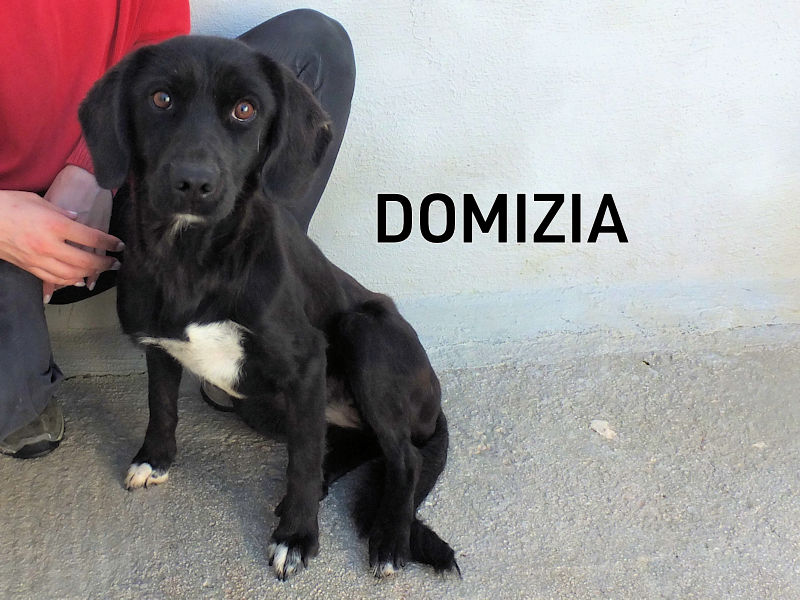Domizia bella cagnolotta dal mantello nero quasi traslucido è una taglia media sui 25 kg. Nata ad ottobre 2021, si è ritrovata per la strada e poi in canile a giugno 2024