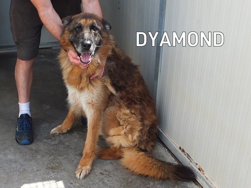 Dyamond è un bel Pastore Alsaziano di taglia grande sui  38  kg. Nato ad aprile 2014, aveva 6 anni quando lo hanno abbandonato facendolo finire in canile ad aprile 2020. Vive in box da solo, possibile fare prova di compatibilità con una femmina. Data la razza, sconsigliamo la presenza di gatti.
