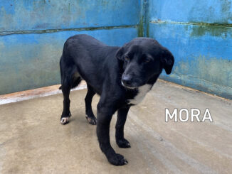Elba cagnoletta nera con la punta delle zampe bianche è una taglia contenuta sui 15-16 kg . Nata a marzo 2022, a soli 4 mesi si è ritrovata in un box di canile .