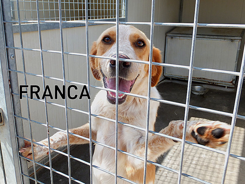 Franca è una bella cagnolina simpatica, allegra e sorridente. Ma al suo padrone cacciatore tutte queste belle qualita’ non interessavano affatto e quando si è reso conto che lei a caccia non era proprio capace, solo una soluzione si prospettava: un classico abbandono per la strada, e addio.