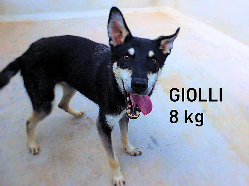 Lui è Giolli maschietto piccolino pesa sui 9 kg. forse persino meno . Nato a fine febbraio 2024 e finito piccolo piccolo in una busta di plastica pronto per morire soffocato ma salvato e poi in canile ad inizio marzo 2024 Orecchie dritte dritte e musetto simpatico, un amore di cagnolino socievole ed allegro . Taglia piccolina sui 9 kg Simpatico, allegro, giocherellone e socievole,