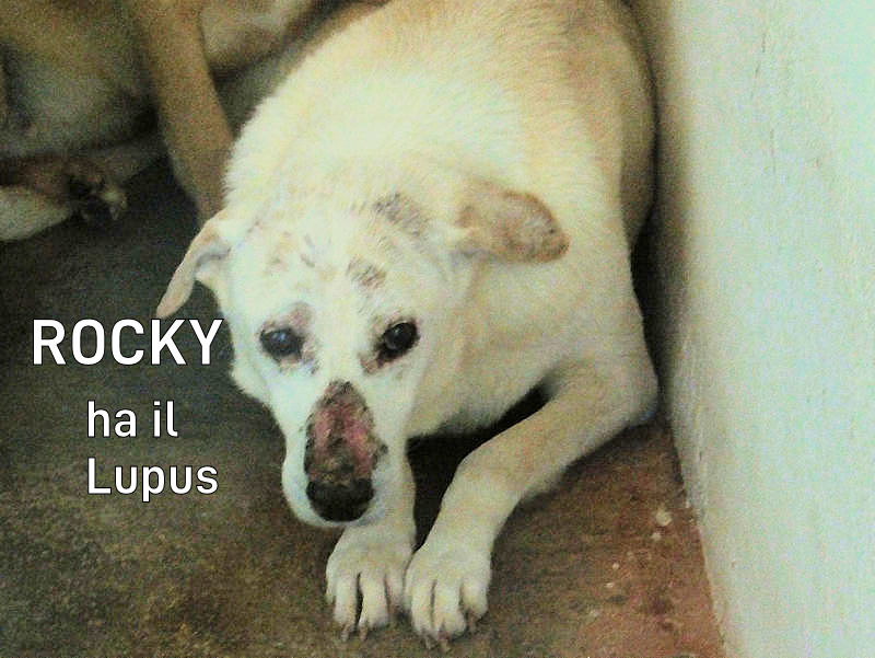 Lui è Rocky,  la sua posizione fa  capire tutta la sua paura di vivere.  Passera’ in quella gabbia ancora qualche tempo,  ha il Lupus, una malattia che, in canile, non gli consentira’  di vevere c a lungo come i suoi  fratelli  prima di farsi trovare morto  in un angolo, senza mai avere vissuto. Forse è quello piu’ fortunato …