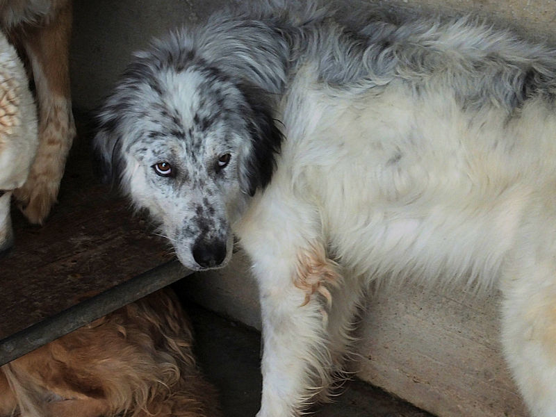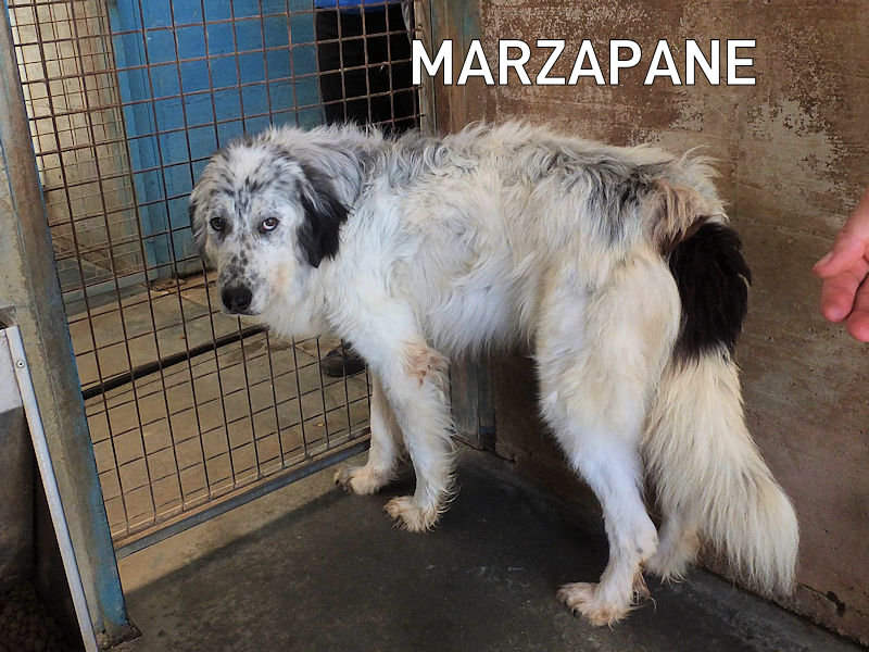 Ecco a voi  MARZAPANE,  un po’ setter e un po’ Maremmano,  quello serio, che non ride e ci guarda con   apprensione, molto preoccupato.