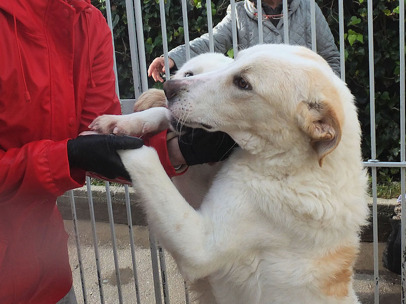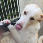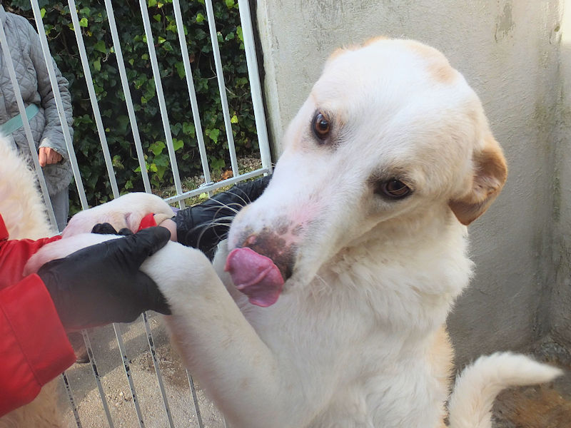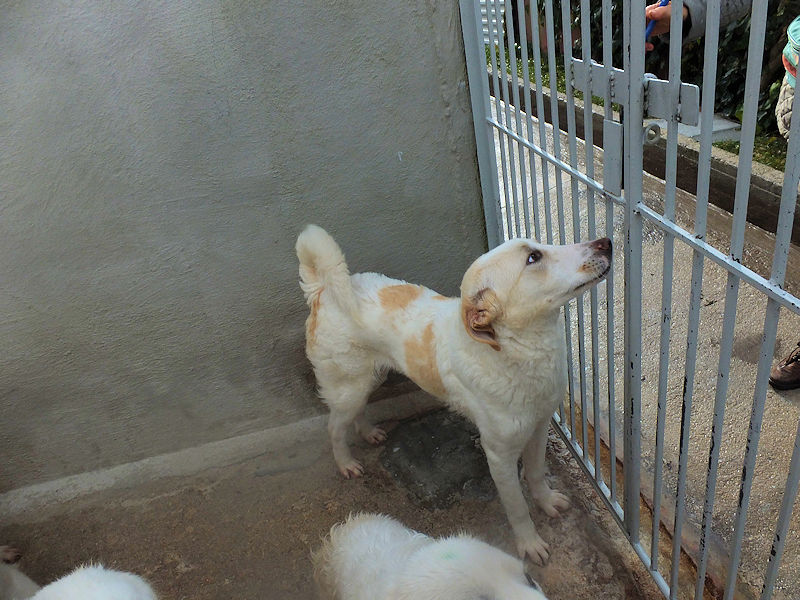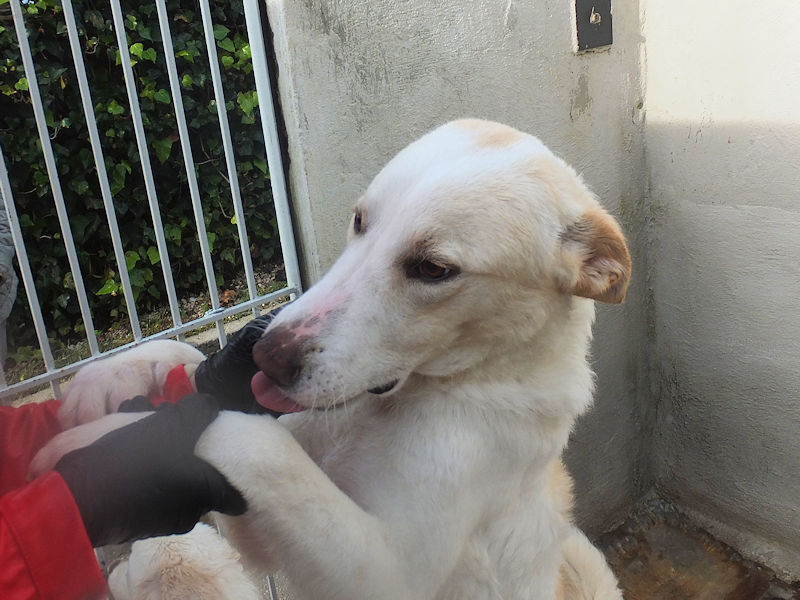 Pian piano tutto è passato, ed ora Leone corre e saltella senza problemi. Ci ha accolti nel box con un grande entusiasmo, subito pronto per fare amicizia, desideroso di coccole e di contatto con le persone. Nel suo box lui è il boss, il re, visto che convive con tre femminucce . Non sappiamo come si comporta con maschi.