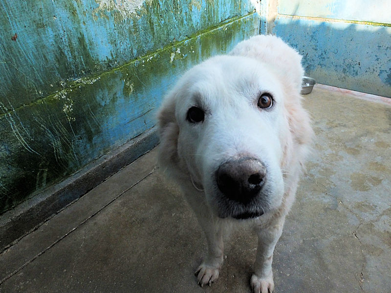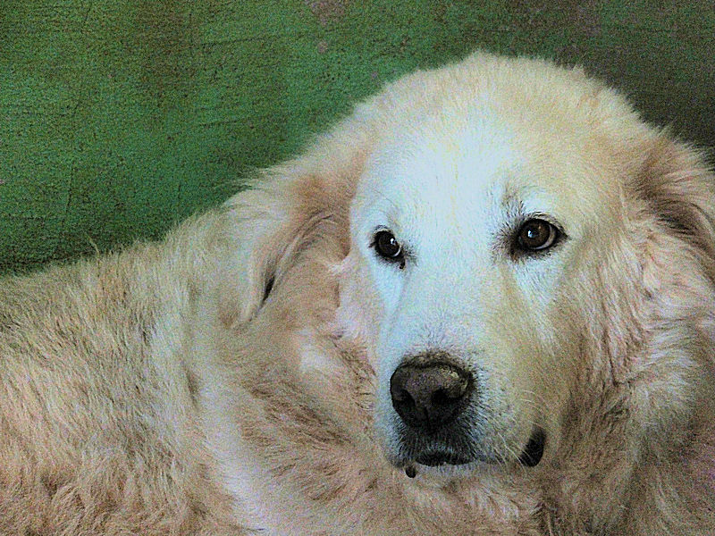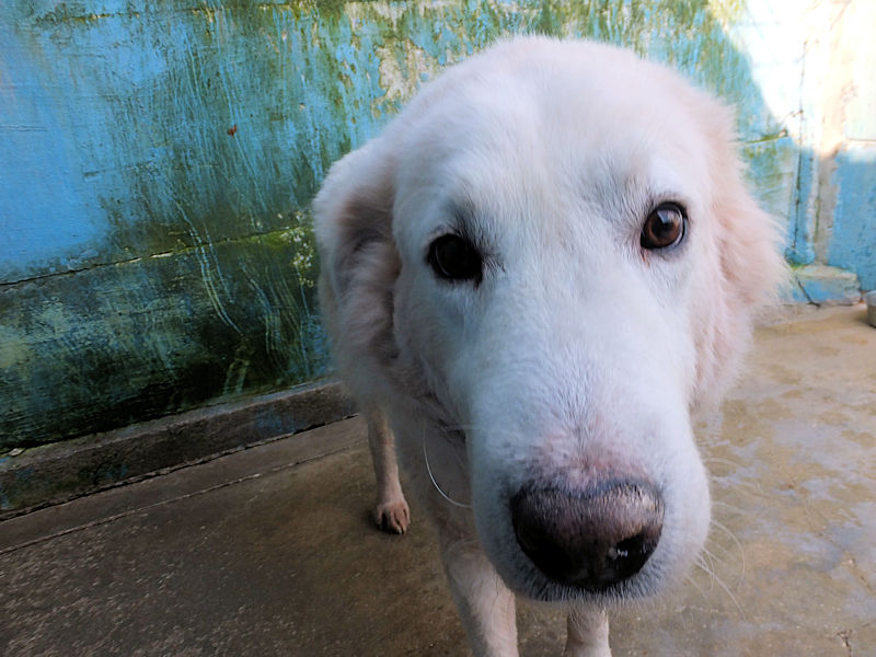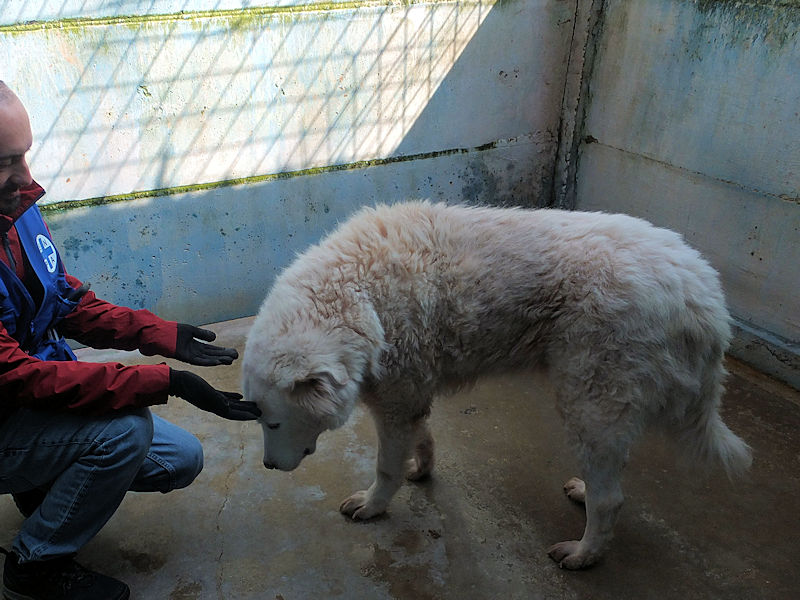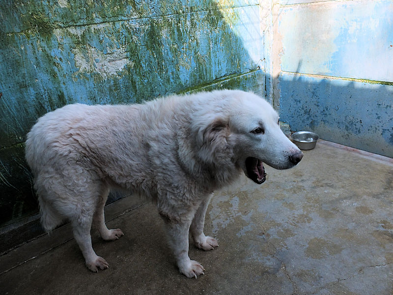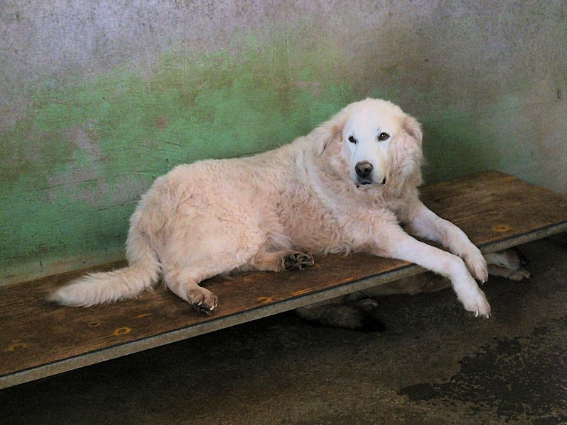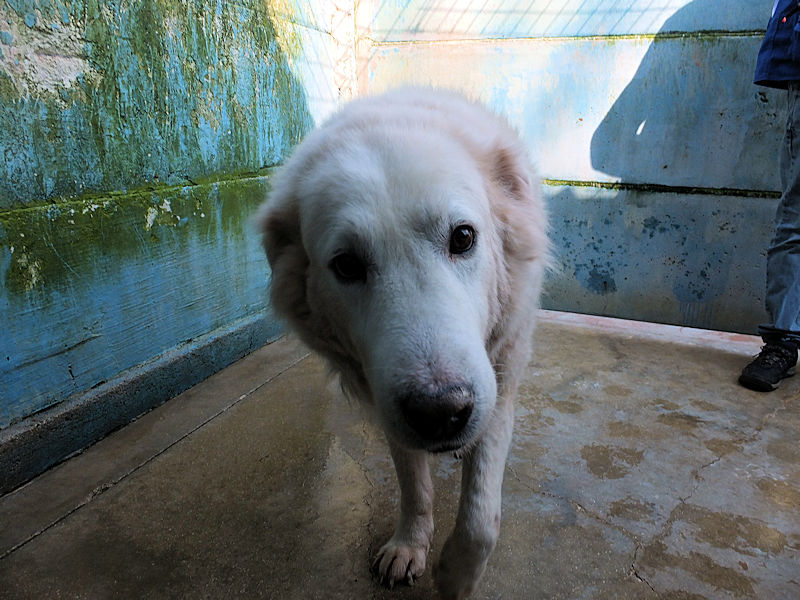 Ci ha accolto con un pizzico di timidezza iniziale, non ci conosceva, non sapeva cosa volevamo. Poi, quando ha capito che poteva avere coccole e carezze, ecco che  si è subito rilassato, e non ci lasciava piu’ andare via. E’ un cane splendido, bello, imponente, un cane …serio. come sempre sono i maremmani, cani per chi conosce la razza e ammira  la loro indipendenza mista a dolcezza.