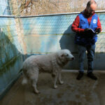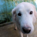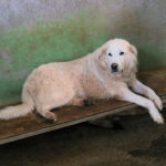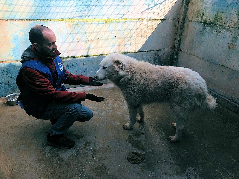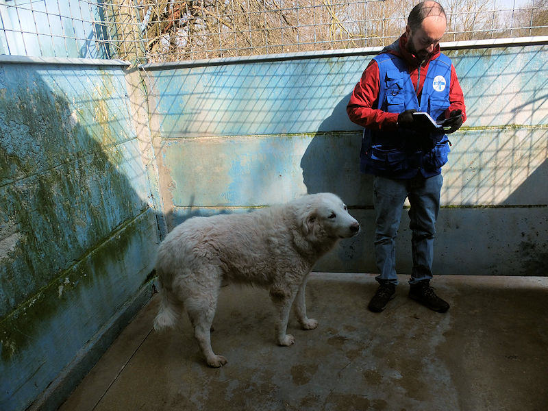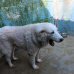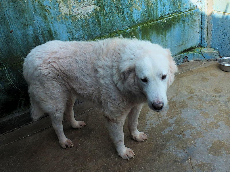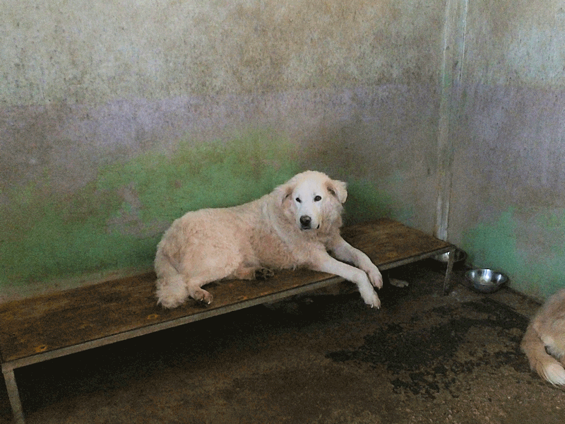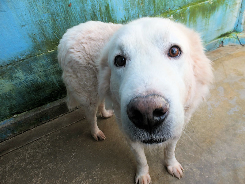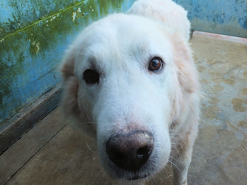 Ci ha accolto con un pizzico di timidezza iniziale, non ci conosceva, non sapeva cosa volevamo. Poi, quando ha capito che poteva avere coccole e carezze, ecco che  si è subito rilassato, e non ci lasciava piu’ andare via. E’ un cane splendido, bello, imponente, un cane …serio. come sempre sono i maremmani, cani per chi conosce la razza e ammira  la loro indipendenza mista a dolcezza.