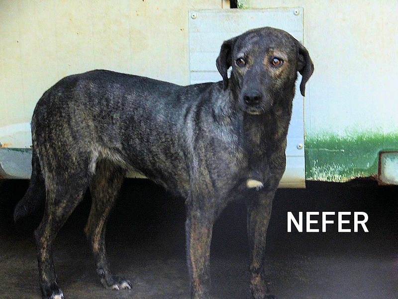 Nefer è una splendida segugio maremmano, di quelli che i cacciatori utilizzano per la caccia al cinghiale. Questi poveri cani vengono spesso tenuti in recinti nascosti nelle campagne, per sfuggire a qualunque controllo di legge, e sono deprivati, escono da quei tuguri solo e unicamente per lavorare per il cacciatore. Nefer viveva col suo compagno, o forse padre, Essex, una vita solitaria, con pochi contatti con le persone, senza mai ricevere, ovviamente, una carezza. I cani dei cacciatori sono degli oggetti, e come tali, ci si regola.
