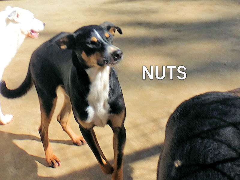 Accalappaiti insieme e finiti in canile, ora condividono lo stesso box, e Nuts ancora oggi si fa forza del suo amico e compagno di prigionia, lo vediamo sempre di sfuggita, nascosto dietro Pong quasi a farsi proteggere . Lo vediamo comunque come un cane buono, deisamente timidino e poco abituato al contatto con le persone, un carattere un poco insicuro, ma è allegro, simpatico, pieno di gioia di vivere.