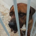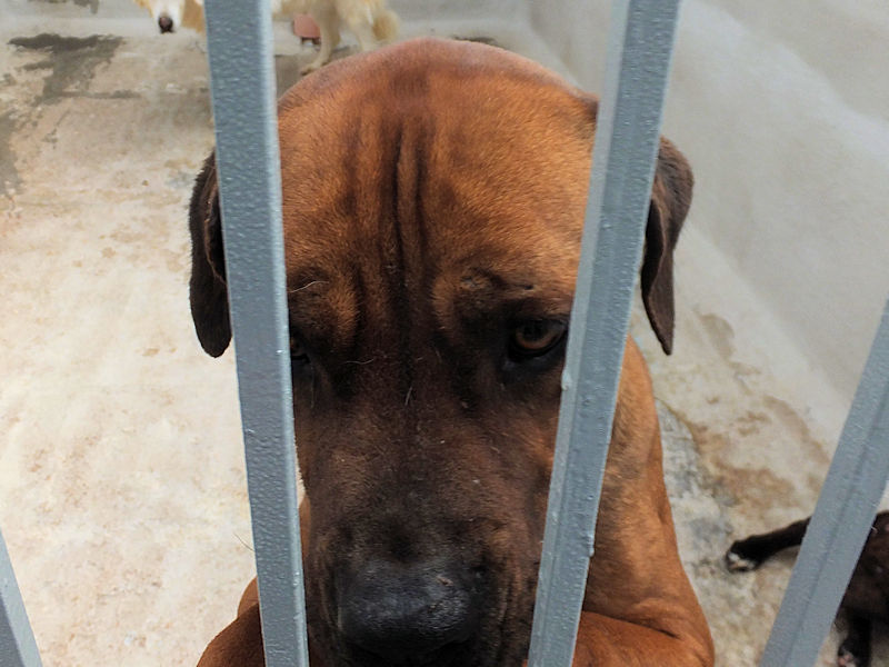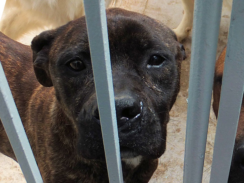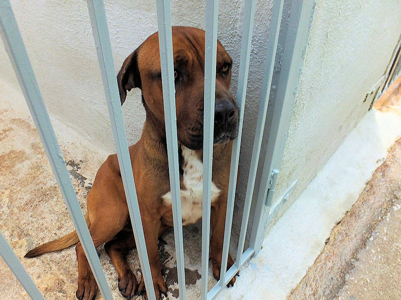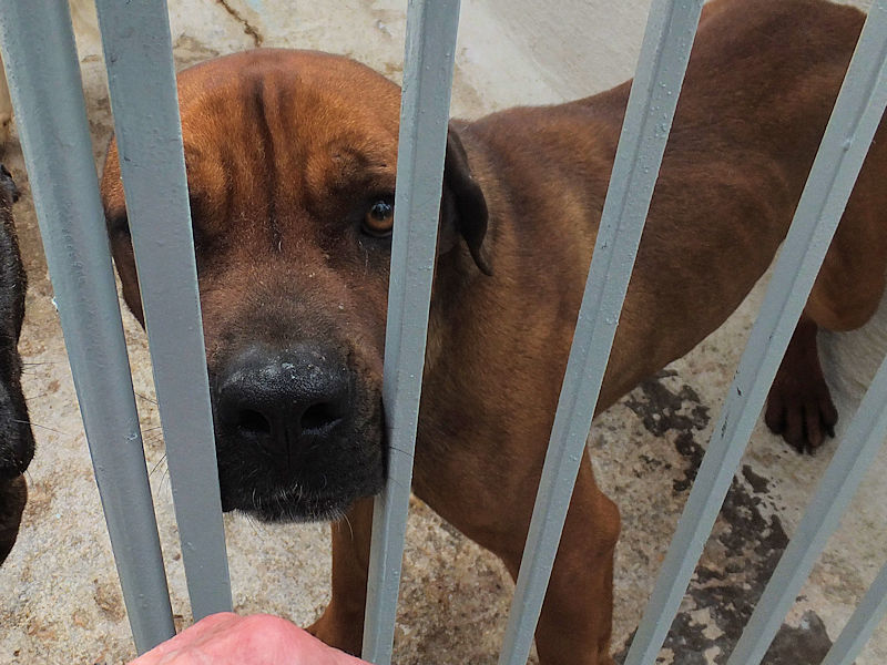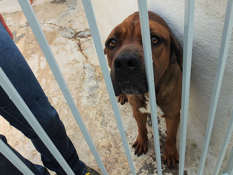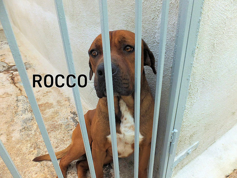 Rocco è un incrocio tra un pitbull ed un cane Corso, massiccio e muscoloso, una taglia mediogrande sui 30 kg. Nato a gennaio 2023, preso di certo in qualche cucciolata data via di corsa, per due anni ha visstuo con chi poi lo ha vergognosamente abbandonato, facendolo finire in canile a gennaio 2025