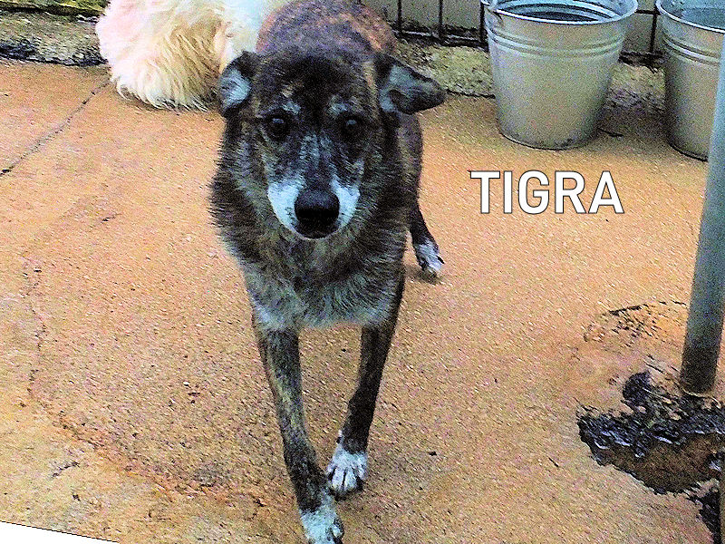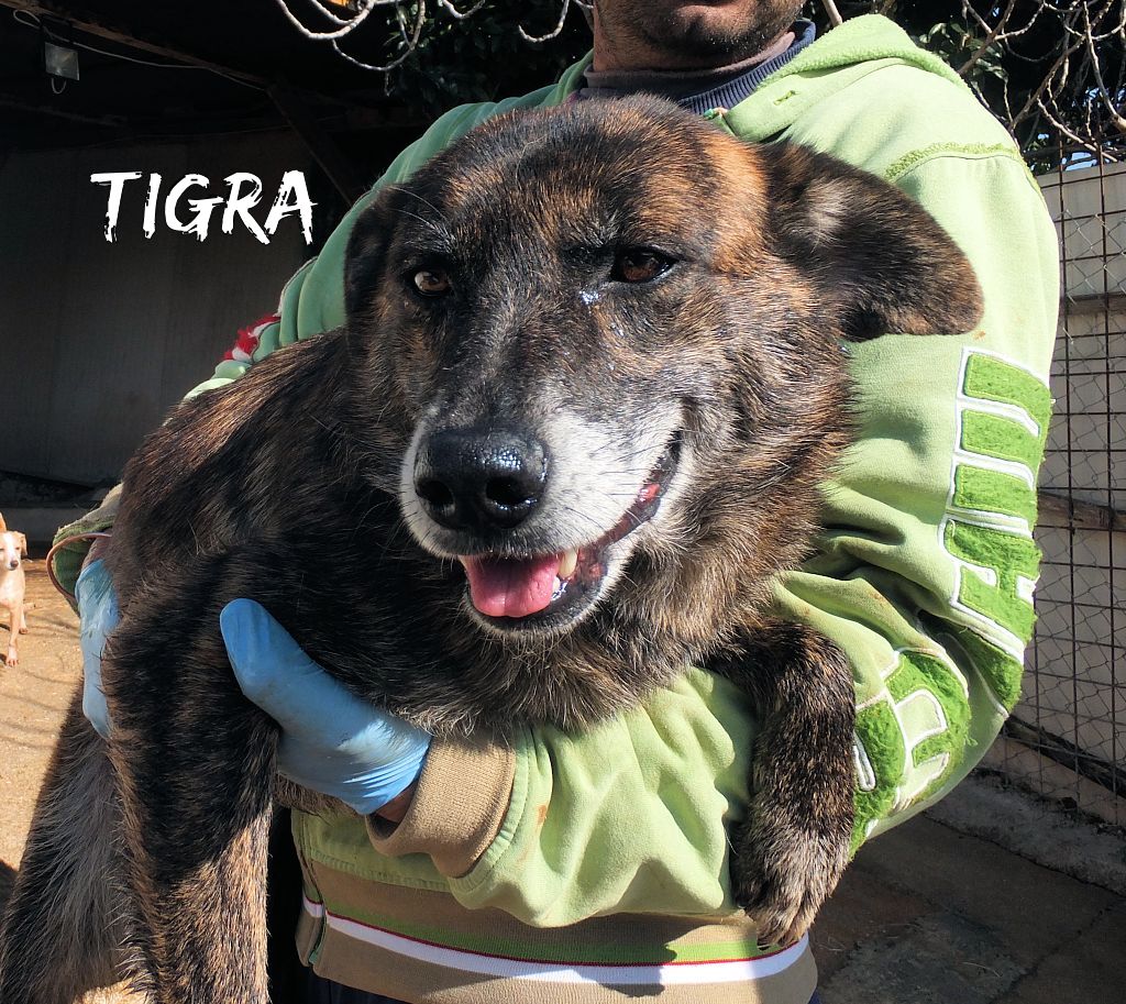 Tigra è una femmina tigrata, sembra un derivato di Pastore Olandese di taglia media sui 18 kg. Nata a settembre 2013, è finita in canile a tre mesi soltanto, a dicembre 2013. Carattere un po’ timido con le persone, un po’ dominante con gli altri cani, anche se va comunque d’accordo conmaschi e femmine, a lei piace fare la “boss”.