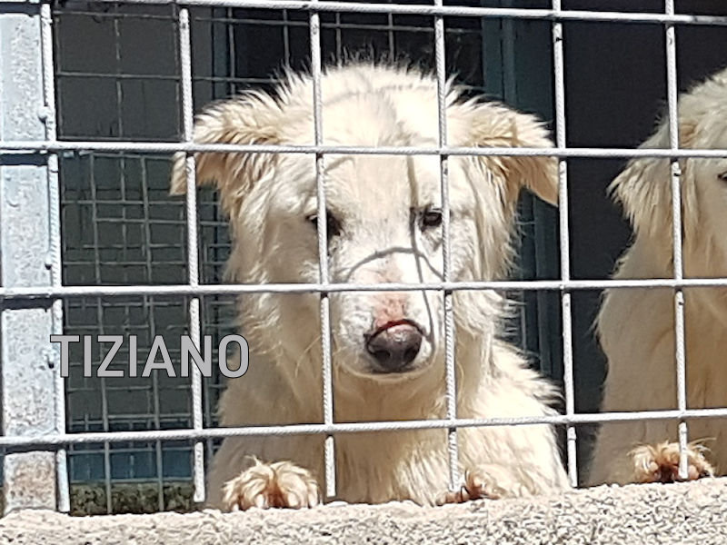 Tiziano bellissimo cagnolotto di taglia mediogrande un tipo Maremmano – Golden è nato il 26 giugno 2019 ed il 30 luglio, dopo 1 mese, era già in un box di canile.